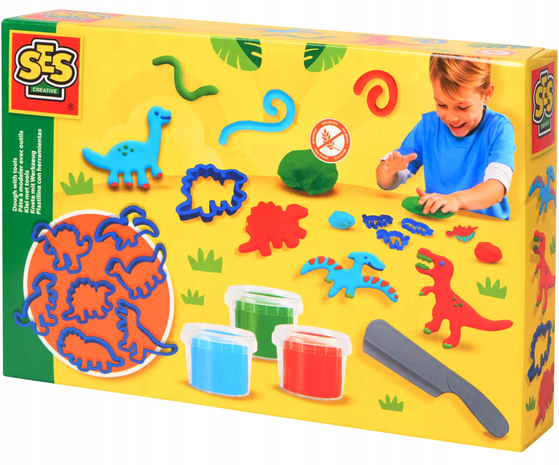 W komplecie znajdują się urocze foremki w kształcie dinozaurów, które pozwalają szybko stworzyć barwne postacie, a także bezpieczny nożyk do ciastomasy, zaprojektowany specjalnie dla dzieci.