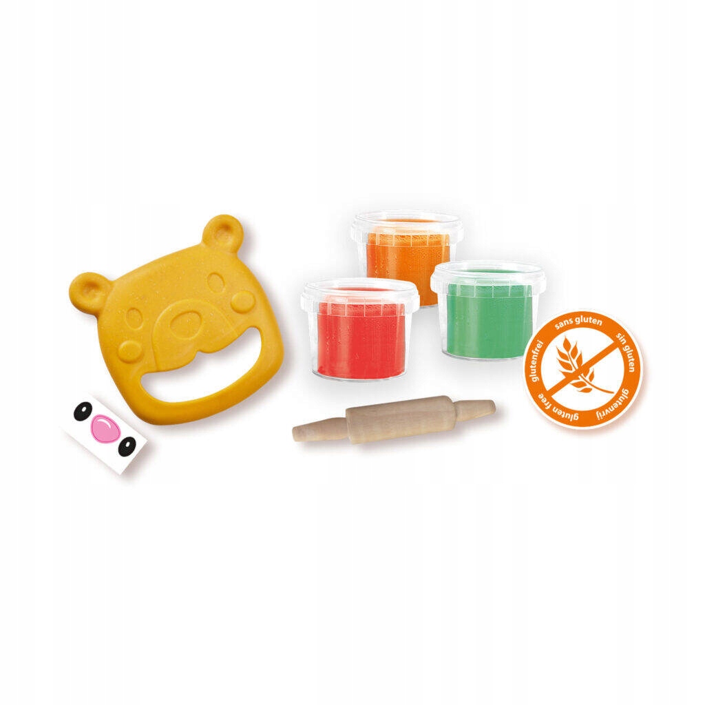 W zestawie znajduje się głowa misia z naklejkami, ciastolina o kolorach: zielonym, pomarańczowym i czerwonym, oraz drewniany wałek