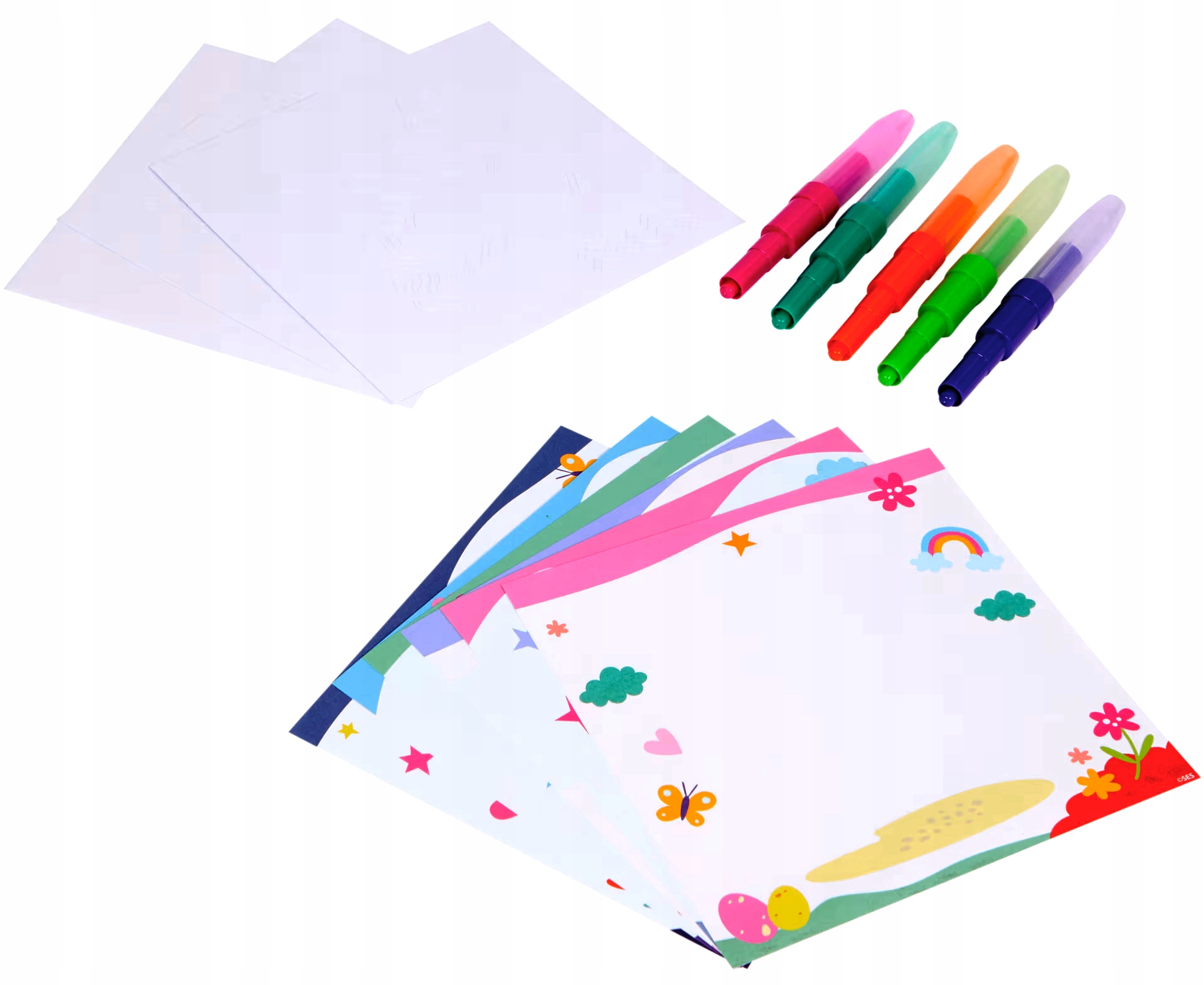 • 5 kolorowych pisaków z końcówką do dmuchania (jasnozielony, ciemnozielony, pomarańczowy, różowy, fioletowy)