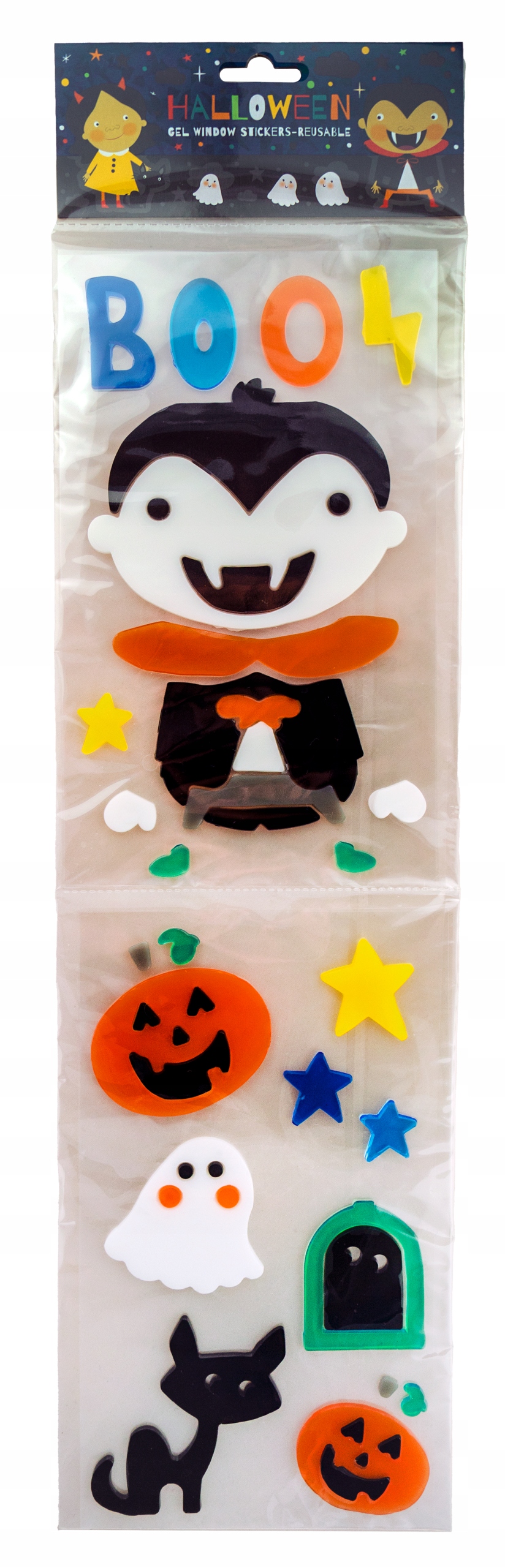 Zestaw żelowych naklejek na okno z wesołymi postaciami halloweenowymi.
