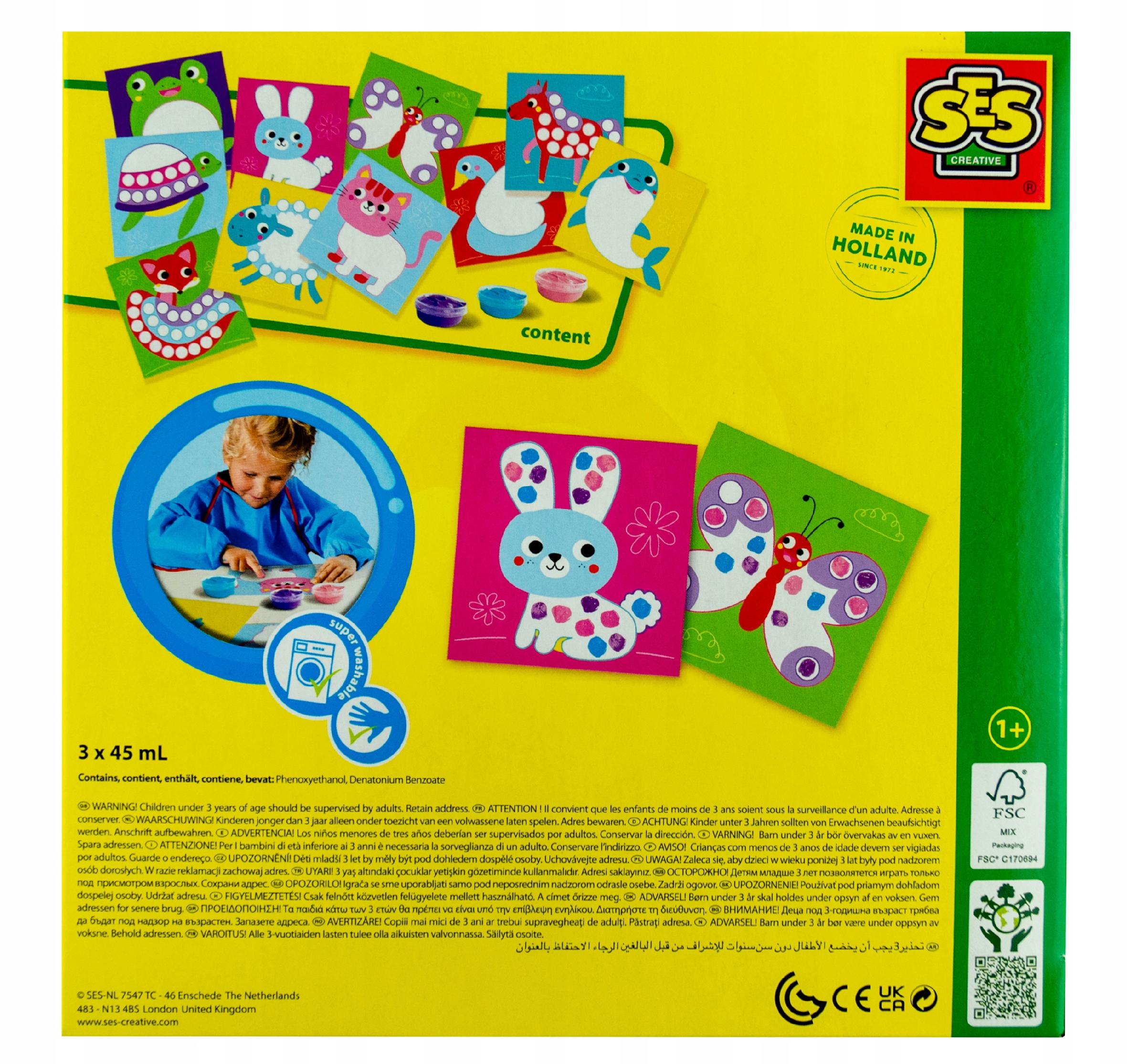 Do zestawu dołączone są 3 bezpieczne, łatwo zmywalne kolory farb, idealne dla najmłodszych odkrywców sztuki. Dzięki nim malowanie staje się nie tylko świetną zabawą, ale również ćwiczeniem motoryki małej, koordynacji oko–ręka oraz rozwijaniem kreatywności.