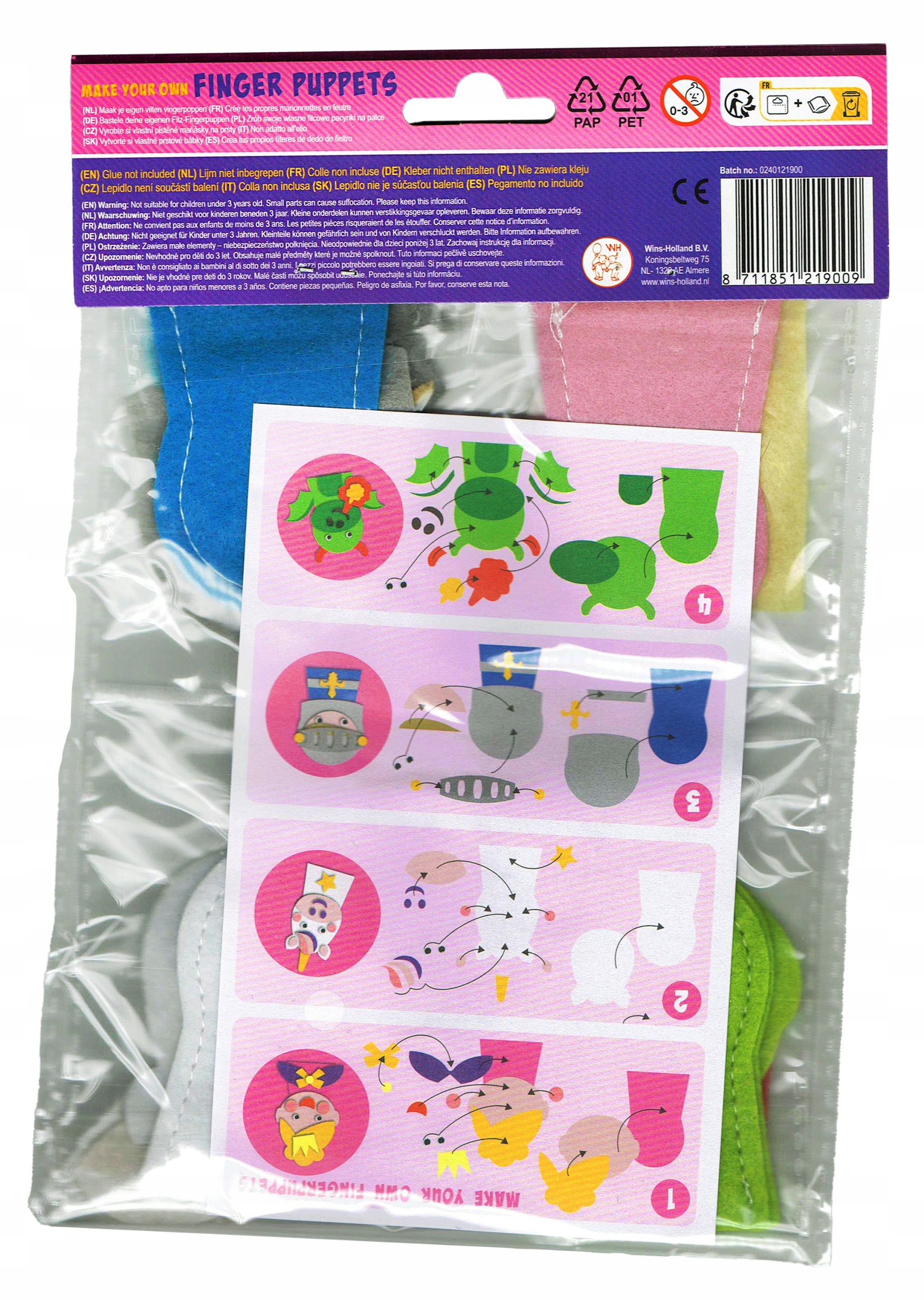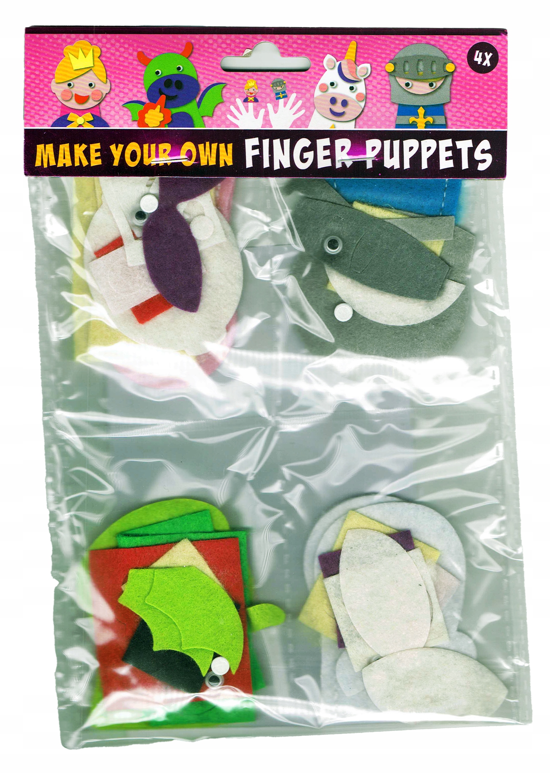 - 4 osobno pakowane zestawy filcu i oczek potrzebne do własnego wykonania pacynek