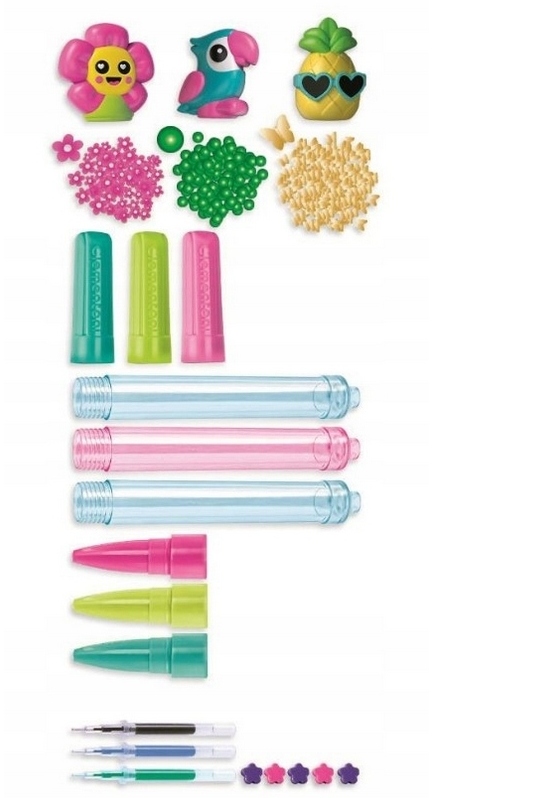 Praktyczny, wieloelementowy zestaw, składający się z: 3. długopisów, 4. tuszy w różnych kolorach, 3. postaci i wszystkich narzędzi potrzebnych do ich wykonania.